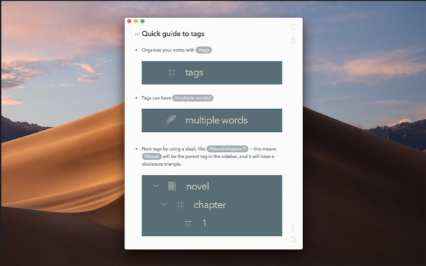 Для организации материала в Bear используются теги, а не папки. Добавляются они в любой части заметки в неограниченном количестве и затем отображаются в левой боковой панели. В них можно вкладывать другие теги, если вы хотите создать более сложную группировку.